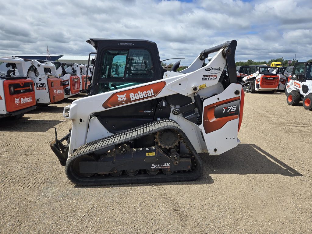 2021 Bobcat T76, 994 Hours, Clear Sides, Cab Heat/AC, Radio, Rear View Camera, Heated Air Ride Seat, SJC Joystick Controls, 2 Speed, Power Bobtach, Reverse Fan, Hydraulic Bucket Positioning, Ride Control, High Flow, Bumper to Bumper Warranty until 6/29/2026 or 2000 hours. No Bucket Included. Rated Operating Capacity (ISO) 2,900 lb Operating Weight 10250 lb Ground Pressure (Rubber) 6.2 psi Auxiliary Std Flow 23.3 gal/min Auxiliary High Flow 30.3 gal/min Joystick Control Standard Emissions Tier (EPA) Tier 4 Engine Cooling Liquid Engine Fuel Diesel Horsepower 74 hp Turbocharged Engine yes Rated Operating Capacity (ISO) 2,900 lb Operating Capacity (50% of Tip) 4143 lb Tipping Load 8285 lb Operating Weight 10250 lb Travel Speed 6.8 mph Travel Speed (2-speed option) 9.2 mph Ground Pressure (Rubber) 6.2 psi Fuel Tank 31.7 gal System Relief @ Quick Couplers 3,500 psi Auxiliary Std Flow 23.3 gal/min Auxiliary High Flow 30.3 gal/min Length 147.1 in Length without Attachment 113.9 in Length with Standard Bucket 147.1 in Width 72.9 in Width (with bucket) 74 in Height 81.8 in Height with Operator Cab 81.8 in Height to Bucket Hinge Pin 128.3 in Reach @ Maximum Height 39.9 in Turning Radius 89.3 in Length of track on ground 59.2 in Track Width 12.6 in Track Width – Optional 17.7 in